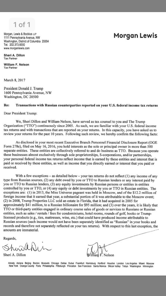 The headline spin on this lawyers statement is out of control. Here's AP's quick article:WASHINGTON (AP) — President Donald Trump’s lawyers say a review of his last 10 years of tax returns do not reflect ‘‘any income of any type from Russian sources,’’ with some exceptions.